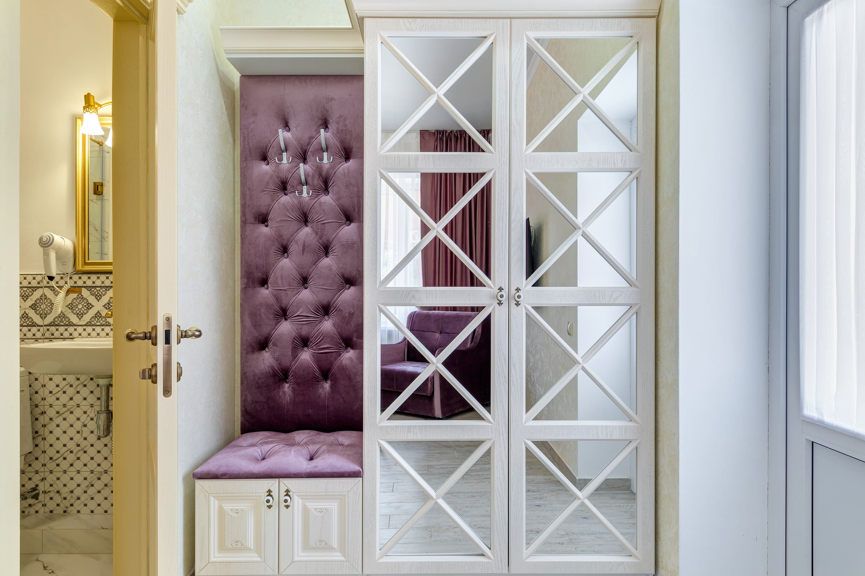- Мебель: вешалка, зеркало, кресло-кровать, кровать двуспальная, прикроватные тумбочки, столик журнальный, стулья, шкаф